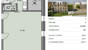 Celková výmera 40,54m2 (hlavná miestnosť 34,77 m2, vstup + kuchynka 4,38 m2, toaleta 1,51 m2)