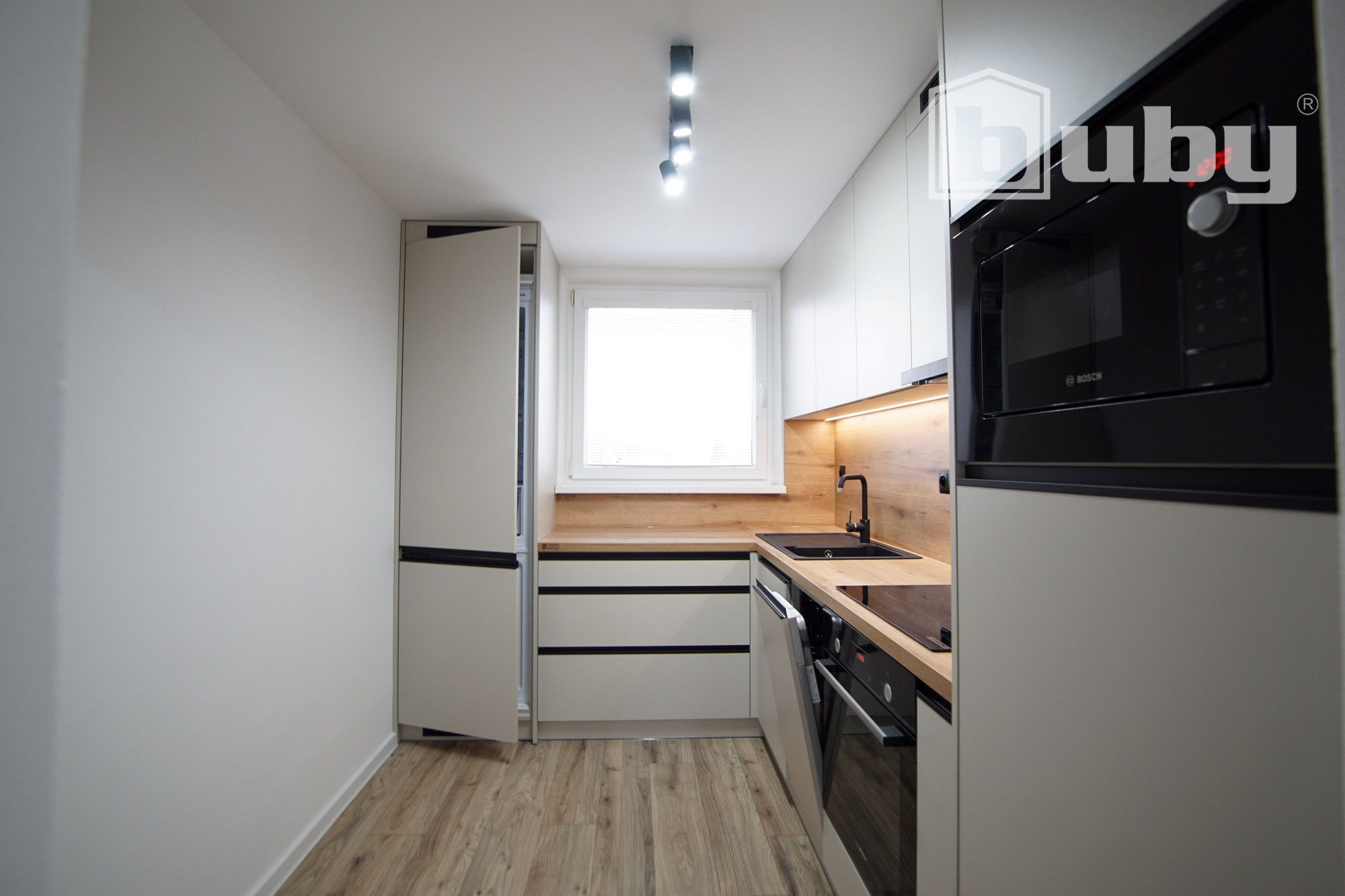 - kuchynskú linku na mieru so vstavanými spotrebičmi (chladnička, umývačka riadu, sklokeramická varná doska, vstavaná rúra a mikrovlnná rúra),