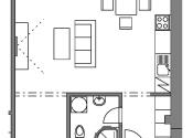 Pozostáva zo vstupnej chodby, kúpeľne so sprchovacím kútom a s toaletou, obývacej izby spojenej s kuchyňou a jedálňou a spacieho kúta.