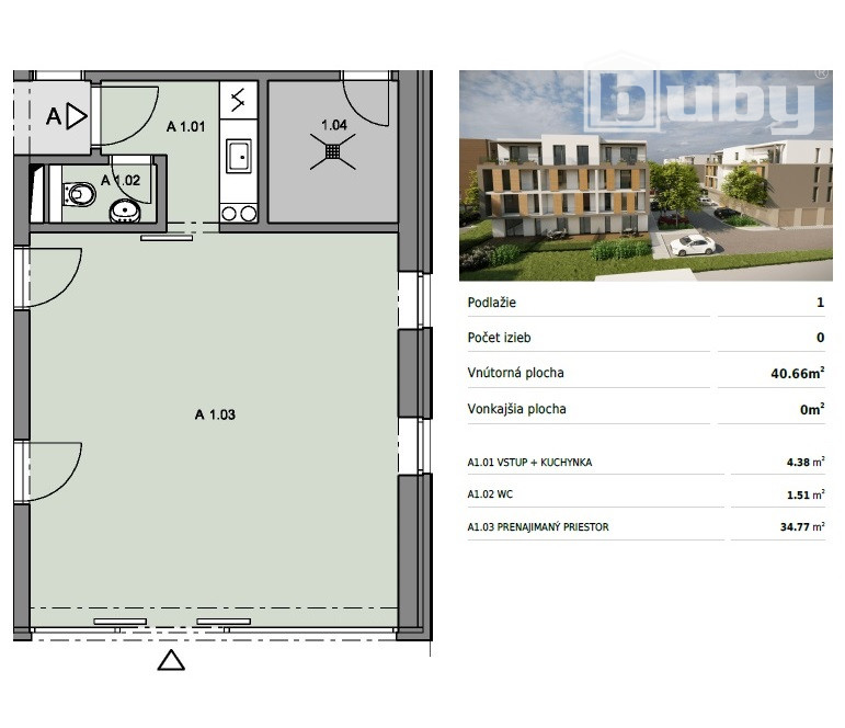 Celková výmera 40,54m2 (hlavná miestnosť 34,77 m2, vstup + kuchynka 4,38 m2, toaleta 1,51 m2)